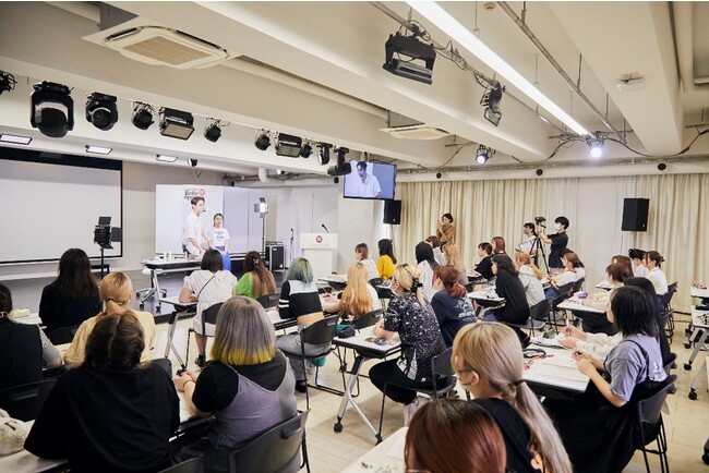 韓国美容に興味がある学生が目を輝かせながら熱心に授業を受けている様子。韓国で実際に活動するメイクアップアーティストの授業を聞ける貴重な機会に学生からの質問が止まらず、本来予定していた時間より大幅に押してしまうほど。