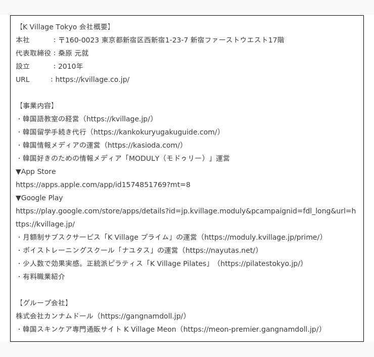 株式会社K Village Tokyoは韓国を中核としたビジネスを推進。主力ビジネスである「K Village韓国語」は約12,000人が通う日本最大の韓国語教室。