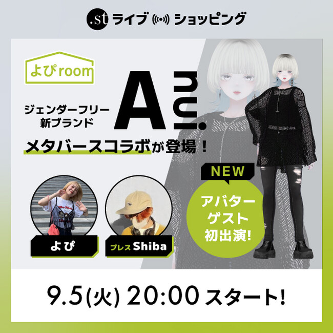 株式会社アダストリア(本部:東京都渋谷区渋谷2-21-1、代表取締役社長:木村 治)が展開する公式WEBストア .st(ドットエスティ)は、メタバースファッション第6弾を9月1日(金)に発売いたします。2022年に .st(ドットエスティ)オリジナルアバター「枡花 蒼」、「一色 晴」の販売開始後、多くのユーザーから支持をいただいてきました。この度、アダストリアに新たに誕生したジェンダーフリーブランド「Anui」の最旬コーディネートを、クリエイターによる創作の総合マーケットBOOTH(※)にて、9月1日(金)12:00より販売開始することをお知らせいたします。販売にあわせて9月5日(火)20:00よりメタバースアイテムと実際のアイテムを紹介するリアルとバーチャルでの融合ライブ配信を実施いたします。