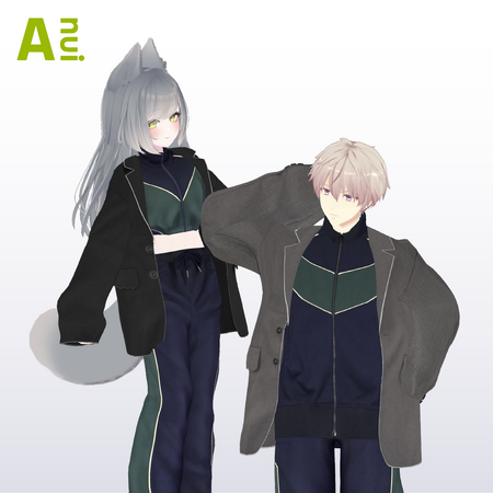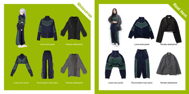細部にこだわったディテールがポイントのオーバーサイズジャケットとレトロな配色が今年らしいトラックジャケットとパンツのセットアップをスポーツ感のあるトラックスタイルにジャケットを合わせてスタイルアップさせたブランドを代表するジェンダーフリースタイル。メタバース内のアバターがリアルと同じようにスタイリングを楽しめるよう3Dで制作。