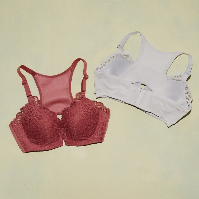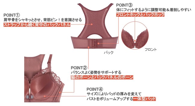 背中側に配したレーサーバック型パネルは、ハリ感と強度のあるパワーネット素材にボンディング加工を施し、肩甲骨をぐっと引き寄せ、背中の丸まりを防止。背中側だけでなくフロントにもホックがあり、フィット感の調節や着脱しやすい仕様です。前面はフェミニンなレースで、機能だけでなくデザインにもこだわりました。