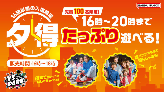 株式会社バンダイナムコアミューズメントが運営する屋内“ヤバすぎ”アクティビティ施設『VS PARK』では、2023年9月27日(水)より16時以降に最大4時間たっぷり遊べる「夕得」プランの販売を開始します。※1