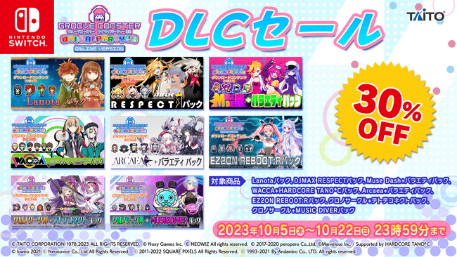 株式会社タイトー(本社:東京都新宿区)は、Nintendo Switch(TM)ダウンロード専用ソフト『グルーヴコースター ワイワイパーティー!!!!』と今年20周年を迎えた「HARDCORE TANO*C」との記念コラボを実施いたします。追加ダウンロードコンテンツ「HARDCORE TANO*C パック」の発売に先駆け、「タイトー音ゲー部2023秋 グルーヴコースター ワイワイパーティー!!!! 新DLC特集!!」にREDALiCE氏、DJ Myosuke氏が特別出演。10月19日(木)20時からYouTube LIVEにて生配信いたします。