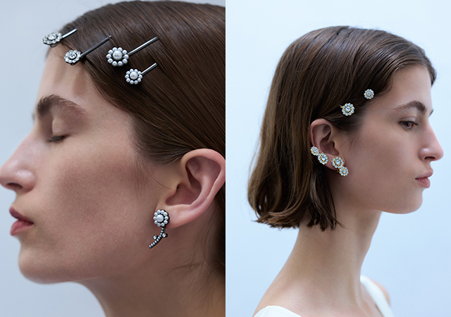 ミニマルなmimosa pin setは着用すると髪に馴染み、光り輝くモチーフが浮かび上がったような仕上がりに。