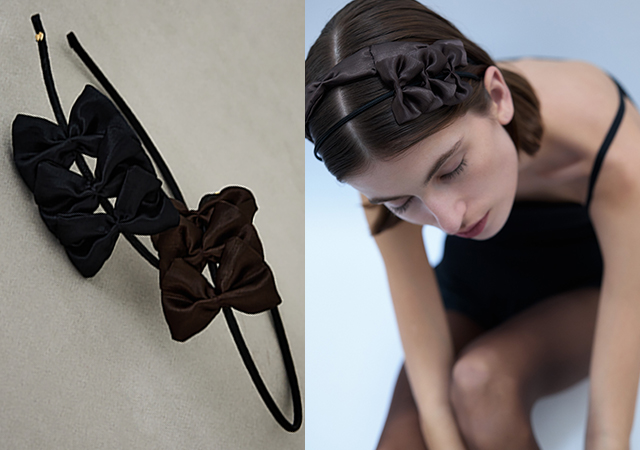 ほっそりとした縦長のリボンを連ねたデザインで、着用すると生地が頭を包み込むような仕上がりのKate headband。髪へのフィット感も高いため、大人っぽく洗練された見た目を保てます。