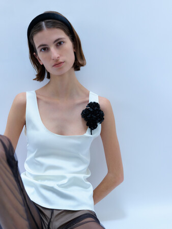 シアーなオーガンジー素材を用いた芍薬の花は、インパクトがありながらも繊細で上品な佇まい。