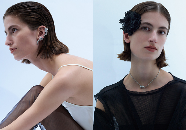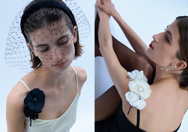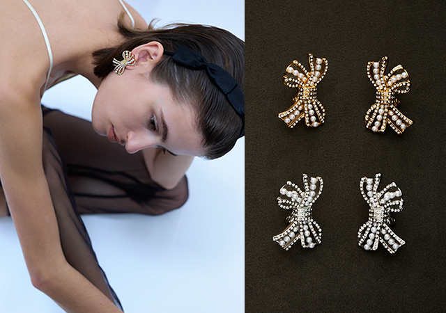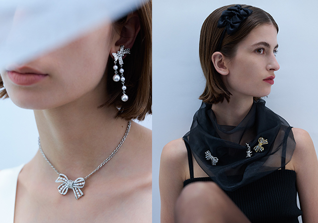 繊細なパーツを大胆に使用し、リボンに備わる甘さや礼儀正しいイメージに、モード感をプラス。