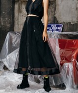 表・裏リバーシブルのMA-1スカートです。チュールをたっぷり使用したドレープ感が特徴で、チュール部分の袖は切り替え素材でツヤ感をプラス。足元が少し透けるデザインが生み出す抜け感がポイントになっています。チュールを裏にするとパッチポケットが付いたカーゴスカートになり、エアリー感だけでなくミリタリーテイストも楽しめる欲張りなアイテムに仕上げました。フロントのジップを開けて、パンツとレイヤードすればまたグッと雰囲気の違うスタイリングに様変わり。リバーシブルMA-1ビスチェとのセットアップコーデがおすすめです。
