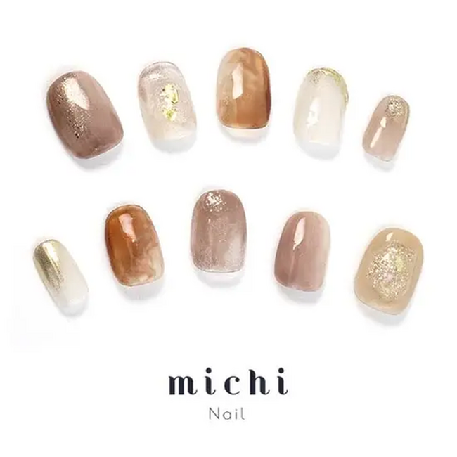 カフェラテカラーが秋らしいネイル。ニュアンスアートとゴールドの組み合わせが高級感のあるデザインです。肌なじみの良いカラーと大人っぽいデザインで、お仕事でもプライベートでも使いやすいネイルチップです。