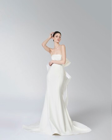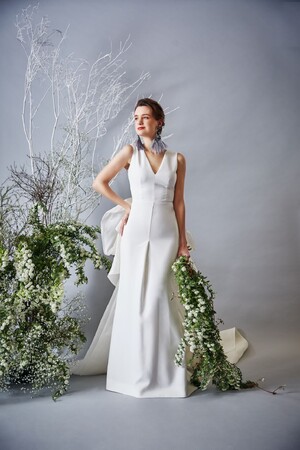今回、隠れた名品も登場、スレンダーとボリュームのある後ろ姿の対比が美しく構築的なリボンレーンがあしなわれたドレスは、どこから見ても美しいシルエットを叶えてくれます。