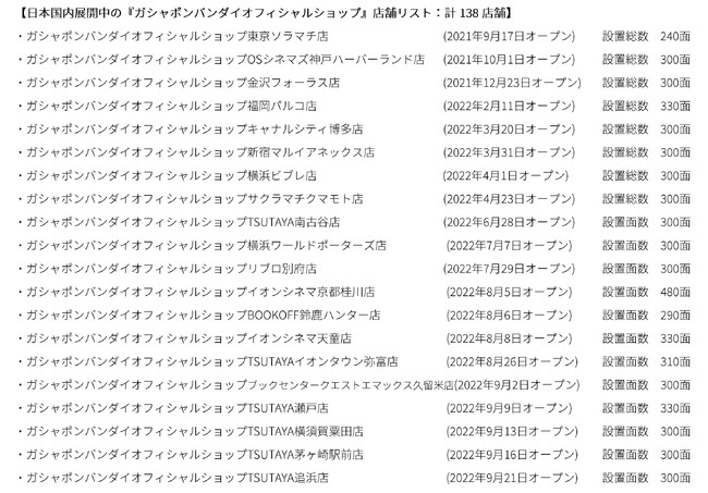 【日本国内展開中の『ガシャポンバンダイオフィシャルショップ』店舗リスト:計138店舗】
