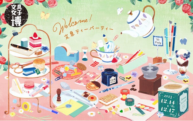 お客様にいつもワクワクした気持ちで会場に足を運んでいただけるよう、毎年違ったテーマを設定して開催しており、2023年のテーマは、「Welcome!文具ティーパーティー」。 ティータイムのような甘いひと時を、大好きな文具と一緒に過ごしてほしいという願いが込められています。