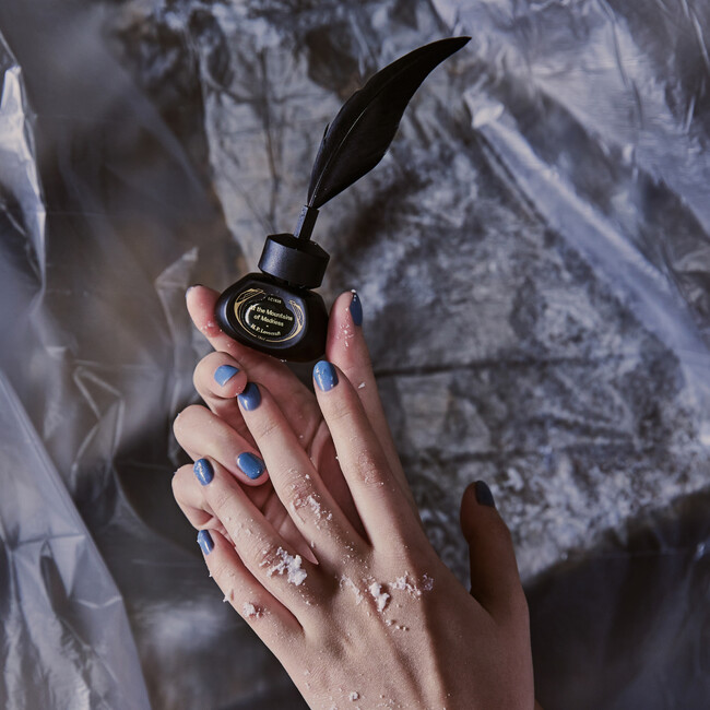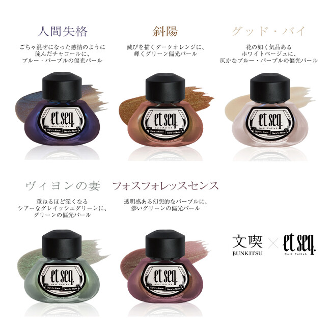 et seq.×文喫のコラボレーションは、文学作品内に登場する人物の言葉へのこだわりや完成された美学を、「自分自身の身に纏うネイルという形で表現したい」という想いから実現しました。羽根ペンをかたどったブラシとインク瓶のようなボトルのデザインになっており、各作品を色や質感、言葉で表現しています。