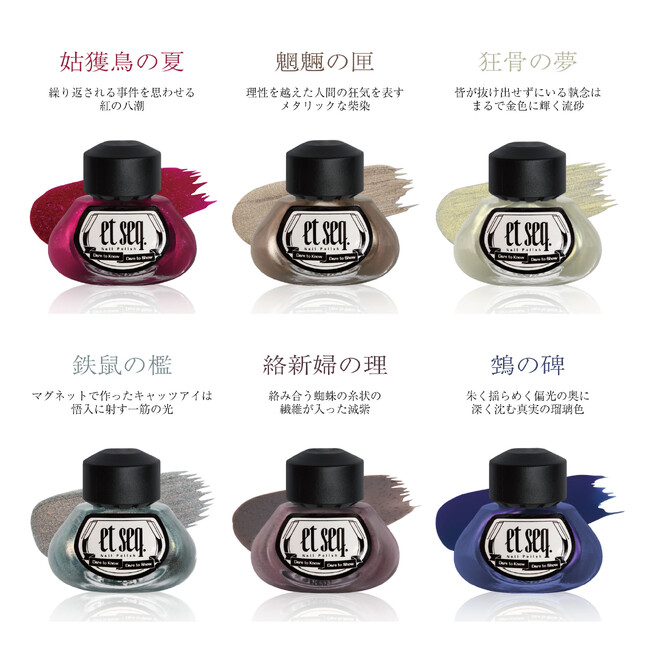 ブランド名の「et seq.」(エ セク)とは、英文文書でよく使われる「以下参照」の略称。羽根ペンをかたどったブラシ、インク瓶のようなボトルなどの印象的なデザインには、「数々の名文を書き記した道具を通してアイデンティティを探そう。過去の文学から「参照」して、色を端書きに変える。自分の姿を知って、自分の色と共鳴し合おう。」というコンセプトが込められている。