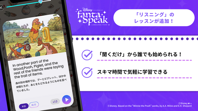 株式会社アルク(東京都千代田区 代表取締役社長:天野 智之、以下アルク)は、ウォルト・ディズニー・ジャパン株式会社監修の英語・英会話アプリ「ディズニー ファンタスピーク」を大幅リニューアルいたしました。基本無料で学べる仕組みや新機能を導入し、「ストーリー」コーナーを大幅にリニューアルしたことで、より多くの方にとって学びやすくなるように、ワクワク感をパワーアップいたしました。