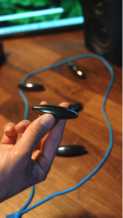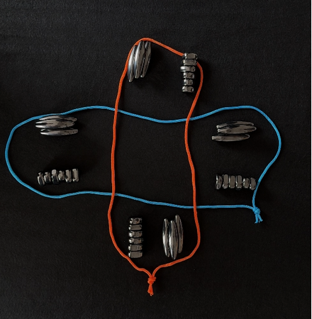 各プレイヤーはそれぞれに配られた磁石をブルーの紐で作られたフィールドの中に順番に一つずつ置いていきます。手持ちの磁石がゼロになった人が勝ち。