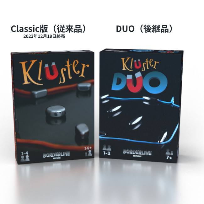 新しくなった「Kluster DUO」では旧バージョンのシンプルなルールと奥深い戦略性はそのままに安全性に配慮し、さらにゲーム性を高めた仕様になっています。マスコミ各社・消費者の皆様におかれましては新しくなった「Kluster DUO」を広く知っていただくと共に、ぜひお手元に取り寄せ、友人、家族、恋人同士などで楽しく遊んでいただきたいと考えております。