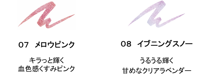 大人気の「ヒロインメイク プライムリキッドアイライナー リッチジュエル」から、繊細なラメ感と血色感のあるくすみピンク「07 メロウピンク」とリッチなラメ感のラベンダーカラー「08 イブニングスノー」が数量限定発売。