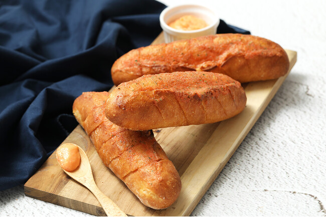 こだわり:定番人気商品『明太子』より展開した柚子胡椒フレーバーです。フランスパンに柚子胡椒が効いた明太子フィリング を塗って焼き上げました。明太子の旨味と爽やかな辛味の柚子胡椒が後を引くおいしさをお楽しみいただけます。