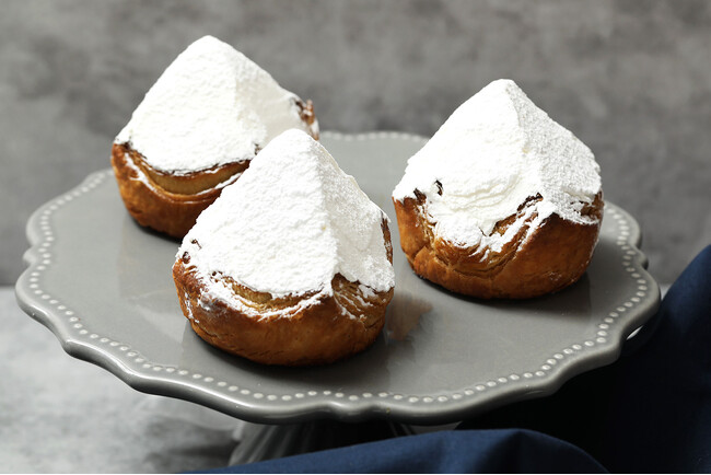 こだわり:イタリアのデザート”モンテビアンコ” を模したデニッシュです。ホイップクリームの中に粒あんを隠し、和と洋を掛け合わせたテイストに仕上げました。ふんわりとしたホイップクリームと優しい味わいの粒あんがマッチ。“冬の山”のような見た目と味わいが楽しい、冬季限定商品です。