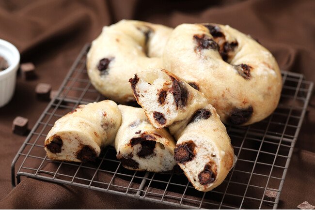 こだわり:軽い食感のキューブチョコを練り込み、餅を包んで焼き上げました。ベーグルの食感にさらに餅の食感が加わることで、よりもちもちとした食感をお楽しみいただけます。仕上げのゲランドの塩がチョコのまろやかなコクを引き立てる、和と洋が織りなすベーグルです。