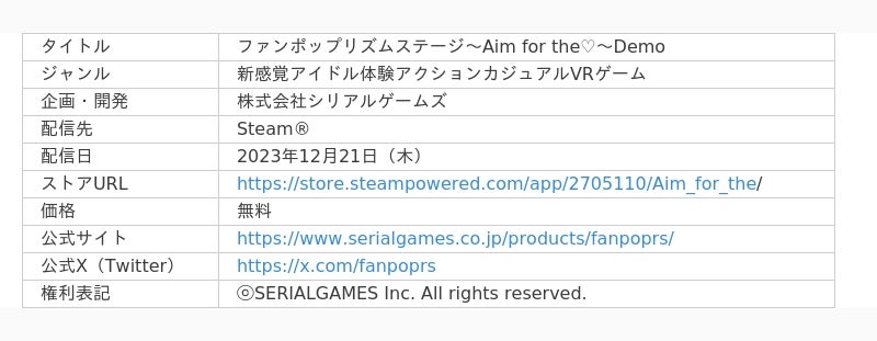株式会社シリアルゲームズ(本社:東京都台東区、代表取締役社長:吉澤 匡)は、新感覚アイドル体験アクションカジュアルVRゲーム『ファンポップリズムステージ~Aim for the(ハート)(エイムフォーザハート)~』の無料トライアル版を、2023年12月21日(木)にSteamにて配信開始いたしましたことをお知らせいたします。