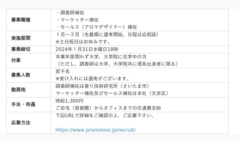 あらゆる香りとニオイを創るセントテクノロジー(香りやニオイに関する技術)カンパニーのプロモツール株式会社(本社:東京都文京区、代表取締役社長:井上賢一、以下:当社)は、卒業年度を問わず、大学院や大学に在学中で香りに興味・関心のある方に向け、ウィンターインターンシップの募集を開始したことをお知らせいたします。