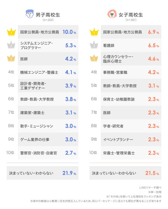LINEリサーチ、全国の中学生、高校生の男女を対象に、なりたい職業に関する調査を実施