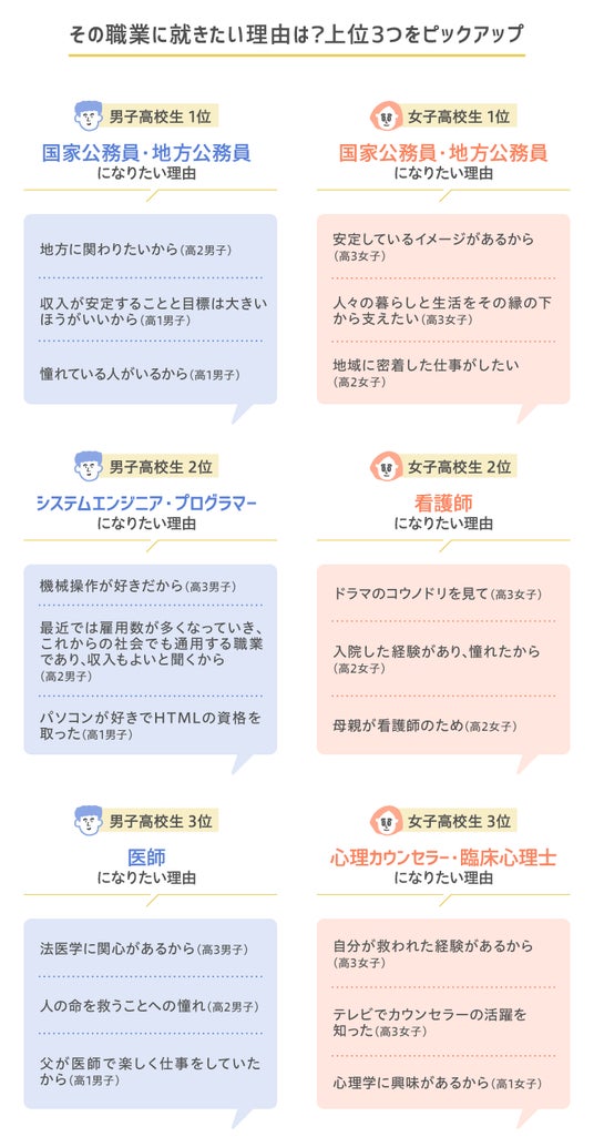高校生のなりたい職業上位3位では、憧れの人や親の影響、収入面の安定や将来性を考えてという理由や、人の生活を縁の下から支えたいなど、さまざまな理由がみられました。