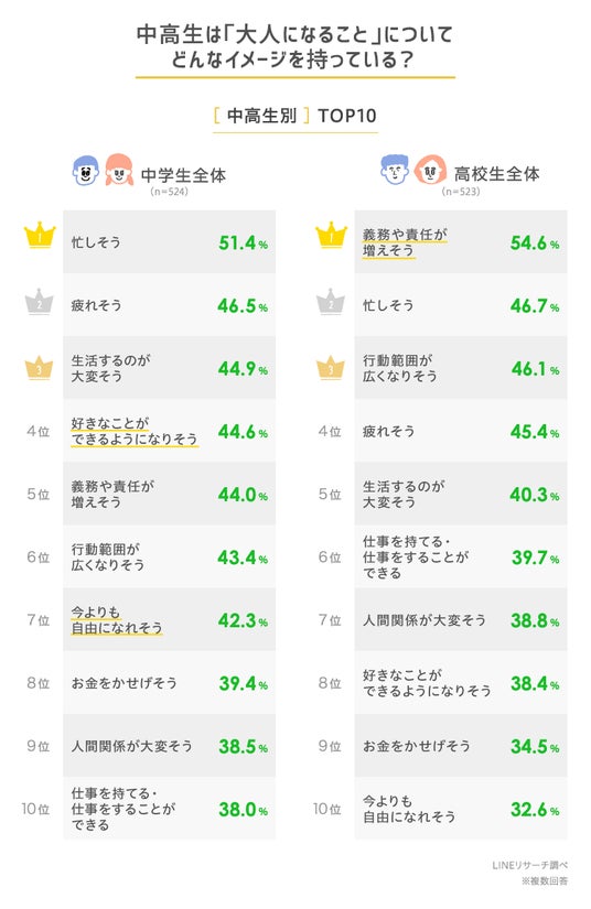 ■「大人になること」のイメージ、中学生は「忙しそう」、高校生では「義務や責任が増えそう」