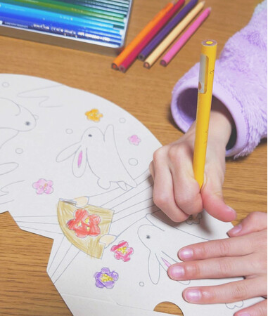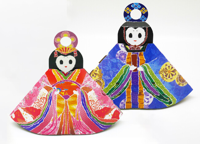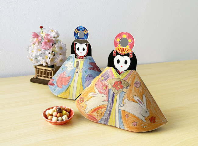 ひな人形のちぎり絵調のデザインは、花や鳥や蝶などテーマにあわせて、一枚一枚パーツを細かく張り合わせて作られたものをプリント。手作りのデザインならではの素朴さとあたたかさがひなまつりに彩りを添えます。2009年からは子供たちが食べた後も楽しめるように、パッケージの衣部分の裏に塗り絵を追加。子供たち自身が好きな色を塗った、自分だけのひな人形を飾ることができるようになりました。