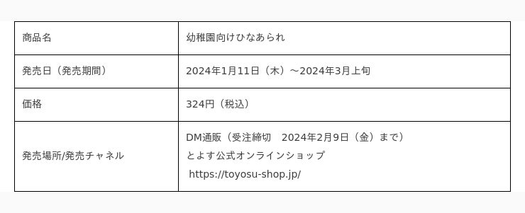 とよす株式会社(本社:大阪府池田市 社長:眞田 昌彦)は、『幼稚園向けひなあられ』を、2024年1月11日(木)から期間限定で発売いたします。