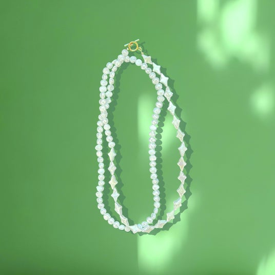 「MIHOKO&SAKAI」 のコレクションの中でも高い人気を誇る、ダイヤ型のパールを使用したネックレスに、オーバル型のパールを連ね、ロングネックレスにリデザイン。同じパールでも、異なる形のパールを組み合わせることで、PIMENTEらしい遊び心とエッジを効かせ、幾通りにもアレンジが効くネックレスが完成しました。