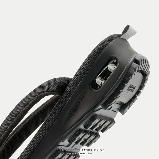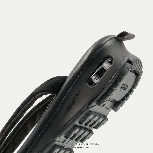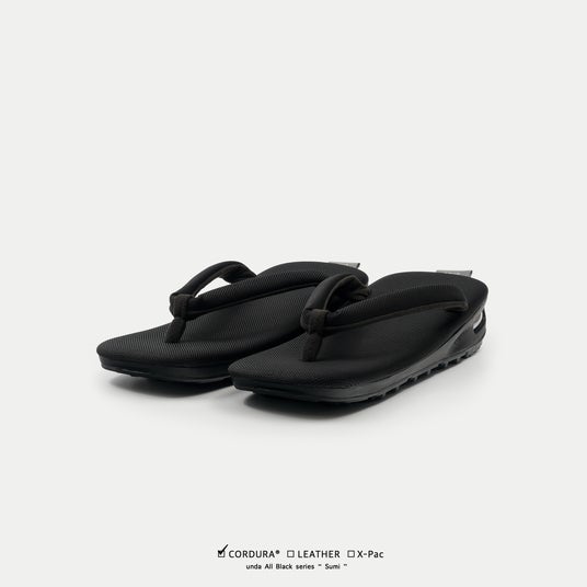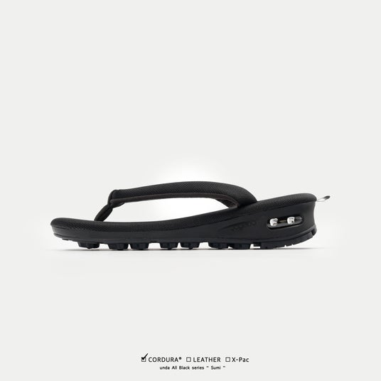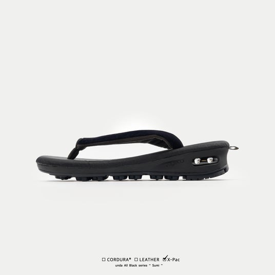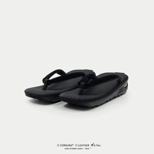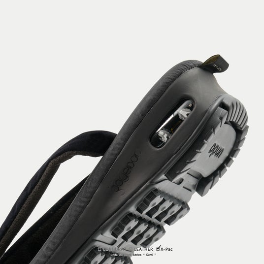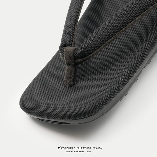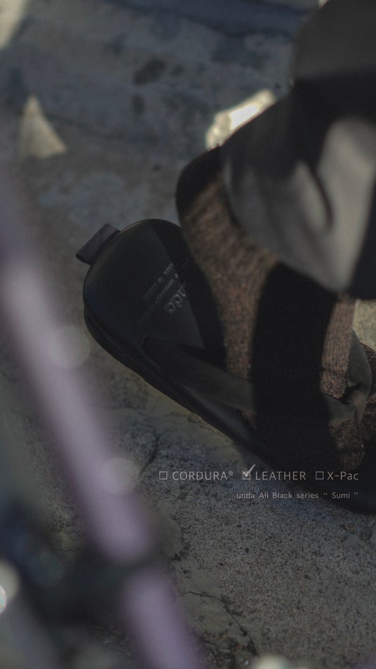 表生地+X-PLYファイバー+裏地の3層構造により、軽量性・高強度・防水性を高い次元で両立させるX-PAC生地を採用。フットベッドの高機能素材に対し、鼻緒には伝統的なビロード生地を採用し、従来のundaよりも細く仕上げることで粋な印象を強めています。