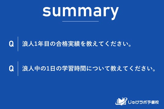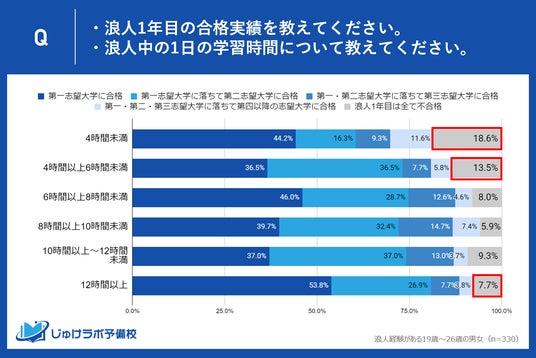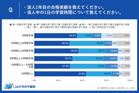 じゅけラボ予備校(所在地:大阪市北区、代表取締役:後藤智則)は、浪人経験がある19歳~26歳の男女330人を対象に、浪人生の勉強時間と合格率の関係性に関する実態調査を実施しました。