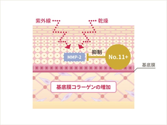 基底膜は紫外線などにより発生するタンパク質分解酵素MMP-2などによって分解されてしまいますが、ライスパワーNo.11+は、基底膜コラーゲンを分解する酵素の活性を抑制して、基底膜を構成する主成分の1つであるコラーゲンの量を増やし、シワ改善に寄与します。