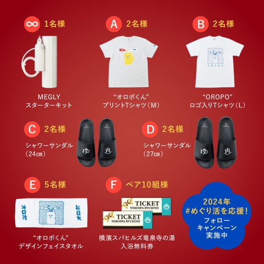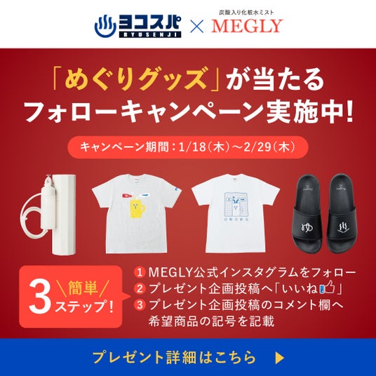 コラボイベント期間中は、男女パウダールームへの高濃度炭酸*¹入り化粧水ミスト「MEGLY」の設置のほか、立春めぐりコラボ特典付き*²商品の販売、合計24名様に豪華「めぐりグッズ」が当たるフォローキャンペーンを実施いたします。ぜひこの機会に「横濱スパヒルズ 竜泉寺の湯」で2024年の“初めぐり”をご体験ください!