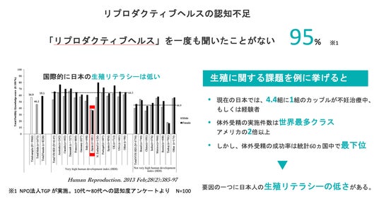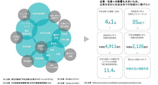 リプロダクティブヘルスとは、「性や生殖に関わるすべてにおいて、身体的にも精神的にも社会的にも本人の意思が尊重され、自分らしく生きられること」を指します。この概念は、1994年にエジプト・カイロで開催された国際人口開発会議において提唱されました。日本でも、国の施策として、内閣府の男女共同参画局では「生涯を通じた女性の健康支援*」にリプロダクティブヘルスに関する意識の浸透や対策の推進などを掲げていますが、この用語が提唱されて30年近くを経た現在も、認知度や関心が低いために、ほとんど議論や改善がされていません。日本は、世界的に見ても周回遅れにて、多くの課題が残っています。すべての人の権利が守られ、安心・安全・健康な生活を送るために企業を含めた社会全体での取り組みが必要とされています。