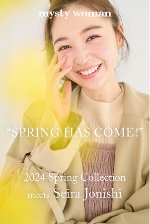ビジュアルのテーマは「Spring has come」。トレンドのチュールキャミとニットがセットになったトップスに、春の訪れを感じさせるトレンチやデニムをあわせたスタイリングや、カジュアルになりがちなボーダーアイテムはこの春も注目のパールボタンをあしらったペプラムシルエットのカーディガンにすることでミスティウーマンらしくフェミニンに昇華させました。モデル・女優の上西星来さんが着こなす一足早く春ムードを先取りしたスタイルをご覧ください。