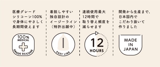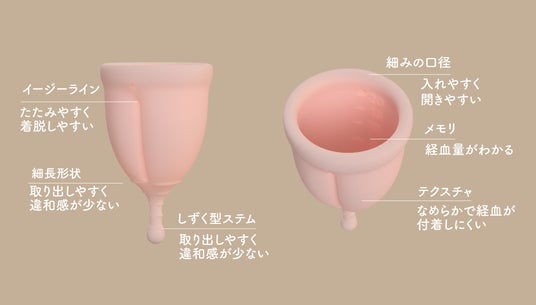 たたみやすく着脱しやすい「イージーライン構造」(特許出願中)、気分が下がりがちな日々が少しでも明るくなるようにこだわったデザイン、不安を軽減するユーザーサポートの充実など、月経カップの使用に踏み出せなかった方々の最初の勇気を後押しする日本製オリジナル月経カップです。