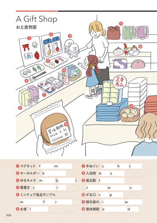 日常生活やレジャーなど、身近な65シーンの絵の中のものを計1000語、日本語や英語の頭文字をヒントに英語で言ってみる、トレーニング形式の単語集です。
