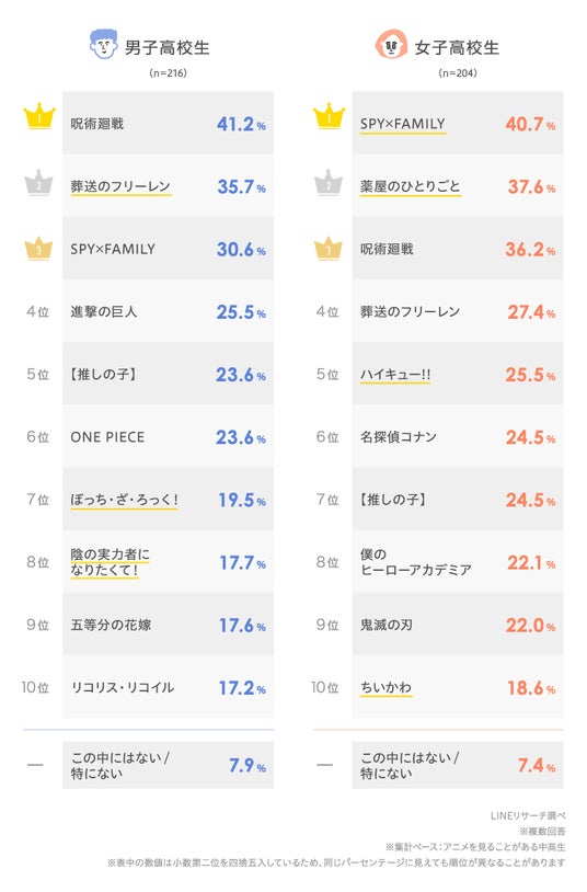 男女別にみると、「葬送のフリーレン」「ぼっち・ざ・ろっく!」「陰の実力者になりたくて!」は、男子高校生の割合が高くなっていました。一方、「SPY×FAMILY」「薬屋のひとりごと」「ハイキュー!!」「ちいかわ」は、男子高校生よりも女子高校生のほうが高い割合でランクインしていました。