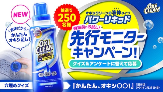 応募フォーム内のクイズと事前アンケートにお答えいただき、クイズに正解された方の中から抽選で250名様にオキシクリーン パワーリキッドをモニター体験していただけます。