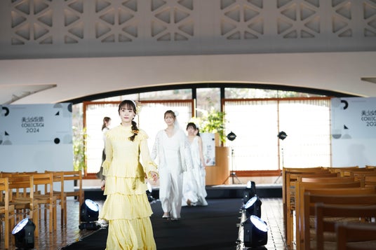 「groove. by kikirico」の地球にやさしい素材を使用したウェディングドレスを、あお(東京美少女図鑑)、mayu(滋賀美少女図鑑)、みく(神戸美少女図鑑)の3名が着用し、視聴者を魅了しました。汐梨(愛媛美少女図鑑)は裁断クズを再利用した淡い色合いのデニムにフレアスカートを合わせたコーディネートで登場し、「Annaut」の世界観を表現しました。自然との調和やエシカルな素材にこだわった「jme.」と「MERCI」のステージでは、彩沢朋花(東京美少女図鑑)、ぷうなな(奈良美少女図鑑)、丸尾陽菜(和歌山美少女図鑑)の3名がシンプルな中にもこだわりの詰まった衣装で登場。ゆずき(美少女図鑑本部)は「粗清草堂(そせいそうどう)」の最大限に羊毛を使用したフエルト製の帽子とワンピースを着こなしました。りのあ(鳥取美少女図鑑)とおとか(愛媛美少女図鑑)はフェアトレード専門ブランド「ピープルツリー」のニットやスカートをきれいめカジュアルに着こなし、Sustainable STAGEのラストを飾りました。