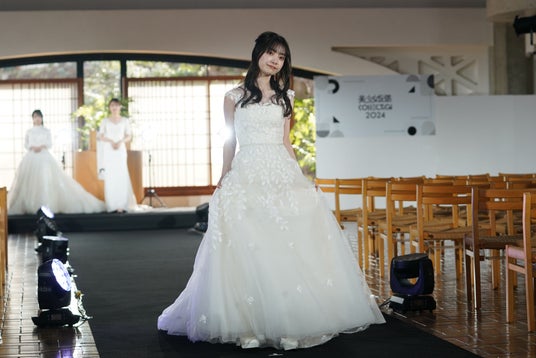 Wedding STAGEには「美少女図鑑AWARD 2023」準グランプリの杉山日向花(岐阜美少女図鑑/NAME MANAGEMENT)に加え、横山舞(広島美少女図鑑)、うえきあやか(株式会社エイチジェイ)の3名が、多岐にわたるSDGs貢献活動に取り組んでいる人気結婚式場「THE ROYAL CLASSIC福岡」で着用できる煌びやかなウェディングドレスに身を包んで登場。豪華なドレスに引けを取らない内面からも滲み出る美しさに加えて、ゴージャスさの中にシックでコンテンポラリーな要素と世界中のトレンドをバランスよく取り入れた花嫁を輝かせる独自の世界観で、配信を見守った視聴者を魅了しました。