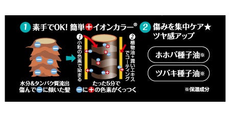 イオン化した+の色素が傷んだ髪に多い-イオンとくっつくからたった5分で発色キレイ♪