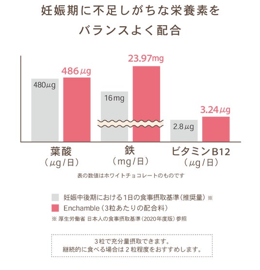妊娠期に不足しがちな葉酸・鉄・ビタミンB12をバランスよく配合。