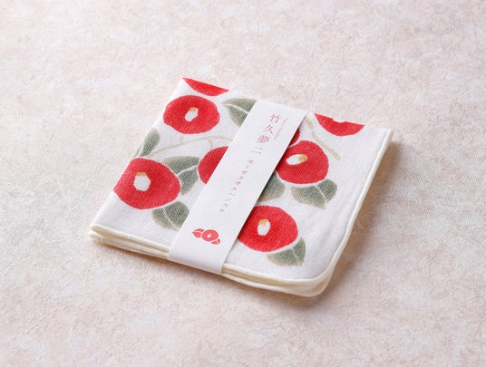日本のグラフィックデザインの先駆者としても名高い竹久 夢二の大胆でポップな椿をモチーフにしたガーゼタオルハンカチ付です。