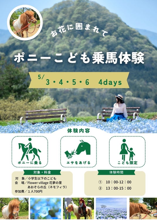 花に囲まれながらポニーの乗馬体験ができます。ゴールデンウィーク限定。