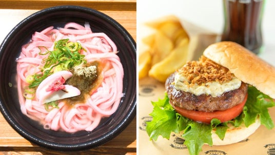 左:ピンク色の麺が特徴の名物「さくらうどん」※写真はイメージです(あおぞら食堂)【営業時間】10:00~15:00(LO 15:00)/右:今年リニューアルした大人気のご当地バーガー「せらバーガー」(ひだまり屋台)【営業時間】9:00~17:00(LO 16:45)
